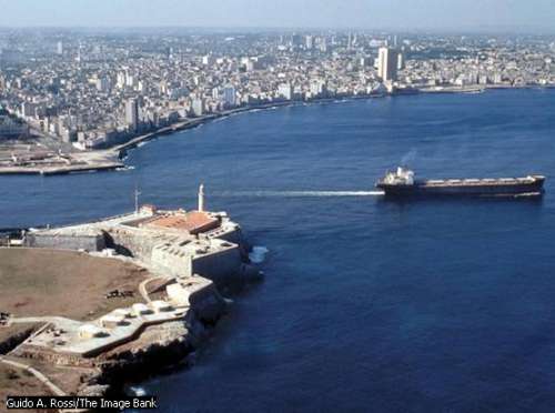 Un carguero sale de la Bahía de La Habana dejando a un lado la fortaleza de El Morro (en primer plano), una de las cuatro fortalezas que guardan la entrada a la bahía. Al fondo se extiende la ciudad de La Habana, capital de Cuba, uno de los puertos más seguros del mundo y el principal, en cuanto a movimiento de entradas y salidas, de la isla caribeña.