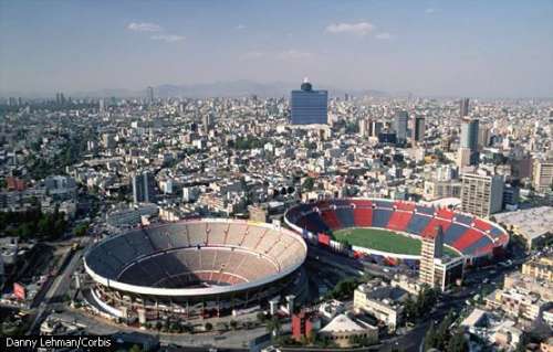 La avenida Insurgentes Sur de la ciudad de México cuenta con dos edificios emblemáticos: la Plaza de Toros Monumental, también denominada Plaza México, y el estadio olímpico. El recinto taurino es el mayor de los que existen en América, con un aforo de unas 50.000 localidades. Por lo que se refiere al estadio, fue decorado por Diego Rivera, quien diseñó un mosaico de vidrio en el que se representa una alegoría del deporte. Ambos recintos se encuentran dentro de la Ciudad de los Deportes, conjunto situado frente a la Ciudad Universitaria y próximo al parque Luis Urbina. De este modo, quedan aunados deporte, espectáculo y saber como esencia del ser humano. Fotografía: Danny Lehman/Corbis