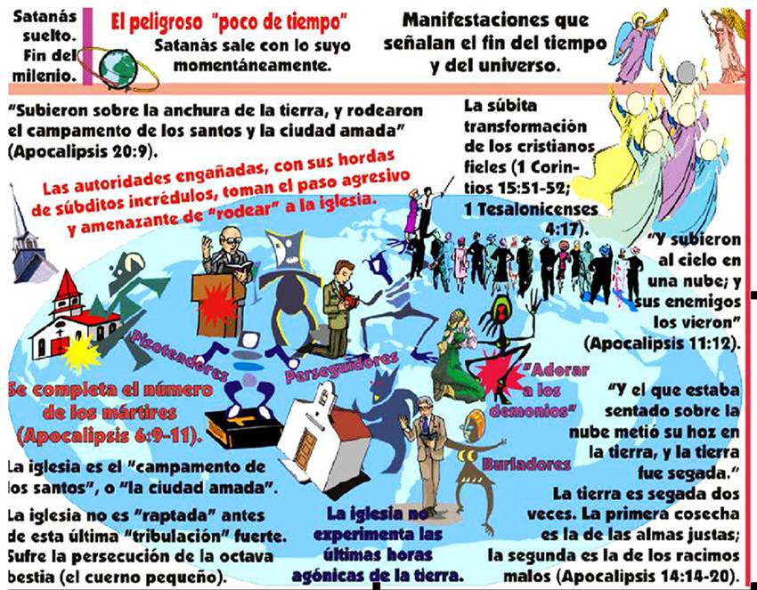 La fotografía de una imagen PowerPoint compuesta de una línea artística del tiempo, una pintura que representa el retorno de Cristo y otra que ilustra al planeta Tierra como huyendo y desintegrándose, contra un trasfondo del espacio profundo.