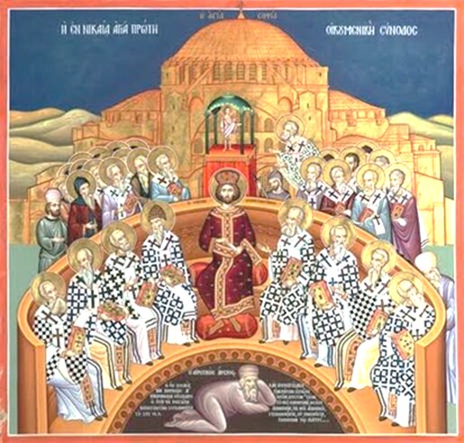 Este ícono del Monasterio Mégalo Metéoron, en Grecia, representa al Concilio de Nicea, celebrado en el año 325 d. C. El emperador Constantino I aparece en el mismo centro, vestido de una túnica de púrpura, mientras Arriano, cuya definición de la Deidad fue rechazada por el Concilio, es representado por la figura acostada debajo de los pies del emperador.