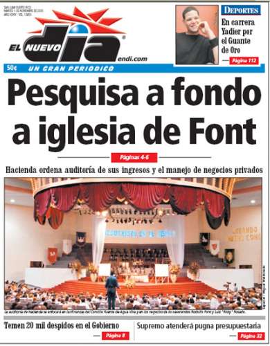 "Pesquisa a fondo a iglesia de Font" Sucesos en Puerto Rico. "Apunta Hacienda a Fuente de Agua Viva." Titulares de primera plana de "El Nuevo Día, un gran periódico". Martes, 1 de noviembre de 2005. www.endi.com Por Miguel Díaz Román [email protected] (Texto del artículo. Enlaces a otros artículos e información relevante publicada en la misma edición de El Nuevo Día .)