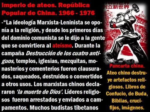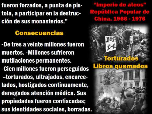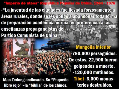 Revolución Cultural en la República Popular de China. Fiera persecución religiosa. Millones de víctimas. Maoismo. Mao Zedong. Chinos declaran la "muerte de Dios". Destrucción masiva de propiedades religiosas. Cien millones perseguidos. Millones muertos. Millones mutilados. "Imperio Global de Ateos" Preparativos para el "poco de tiempo" y Armagedón. Tres imágenes (diapositivas) para PowerPoint y otras aplicaciones.