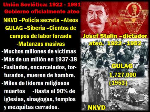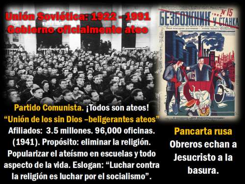 Unión de Repúblicas Socialistas Soviéticas. 1922 - 1991. Gobierno oficialmente ateo."Unión de los sin Dios" "Unión de los beligerantes ateos" 1941 -Afiliados: 3.5 millones. 96,000 oficinas en toda la Unión Soviética. Propósito: eliminar la religión de todo renglón de la vida rusa. Popularizar el ateísmo en escuelas. Eslogan: "Luchar contra la religión es luchar por el socialismo". Policia secreta. KGB. NKVD. GULAG. Josef Stalin, dictador ateo por treinta años. Muchos millones de víctimas. Persecución relgiosa en la Unión Soviética. Ortodoxos, católicos, protestantes, musulmanes, judíos perseguidos. Dos Presentaciones gráficas. Pertenecen a la serie "Imperio Global de Ateos". -El ateísmo en la República Popular de China -El tsunami de ATEÍSMO formándose y acercándose rápidamente Masas de niños y adolescentes secularizados en el Hemisferio Occidental, al igual que en Europa.