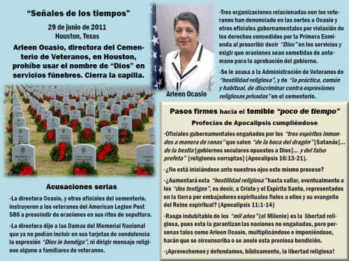 Cierra la capilla del cementerio, convirtiendo el local en mero "lugar de reuniones". 29 de junio de 2011. Arleen Ocasio, otros oficiales del cementerio y la Administración de Veteranos denunciados en las cortes. Pasos firmes hacia el temible "poco de tiempo" apocalíptico. PowerPoint. Imagen (diapositiva) para PowerPoint y otras aplicaciones, con notas adicionales. Serie: "Señales de los tiempos" Una cuantas aportaciones componen esta serie, la cual seguimos desarrollando.