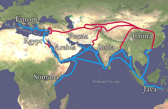 Algunas rutas principales marítimas y terreras para la transportación de sedas, piedras preciosas, especies aromáticas, maderas olorosas, etcétera,
