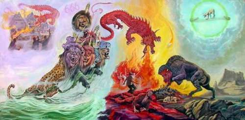 A la izquierda, en primera plana, aparece la Primera Bestia de Apocalipsis 13.