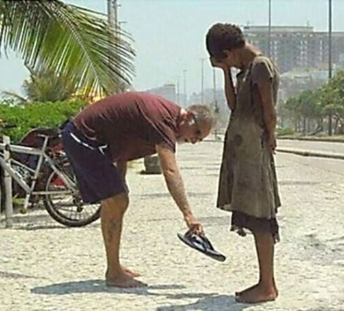 Este varón se quita sus sandalias, obsequiándoselas a una damita sin hogar.