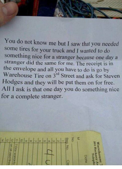 La nota dice: “Aunque no nos conocemos, observé que le hacía falta neumáticos para su camioneta, y quería hacer algo bueno por un extraño, pues un día un extraño hizo algo semejante para mí. El recibo se encuentra