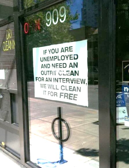 El rótulo lee: “Si usted está desempleado, y necesita que se limpie una vestidura para una entrevista, se la limpiaremos gratuitamente”.