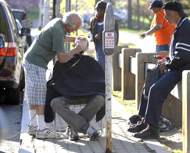Esta es la oferta insólita y generosa de un barbero, quizás retirado, cuya barbería es la calle.