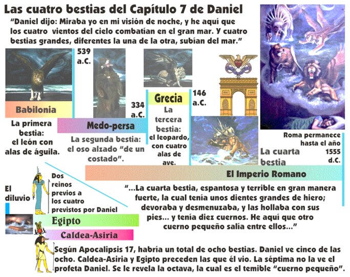 “Miraba yo en mi visión de noche, y he aquí que los cuatro vientos del cielo combatían en el gran mar. Y cuatro bestias grandes… subían del mar.”