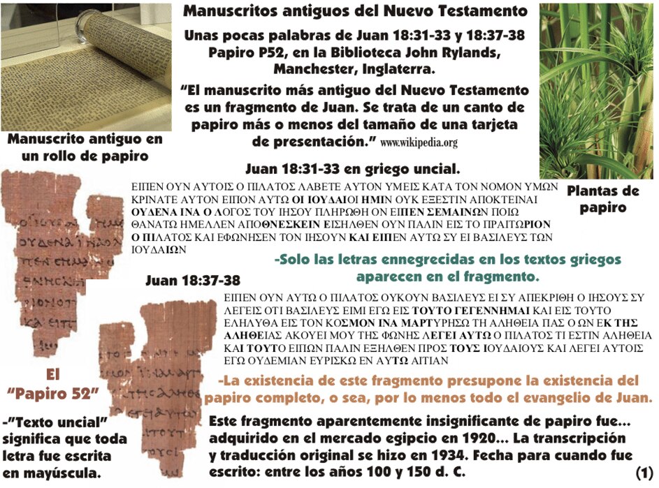 El manuscrito más antiguo del Nuevo Testamento es el Papiro 52. Se trata de un cantito de papiro del tamaño, más o menos, de una tarjeta de presentación.